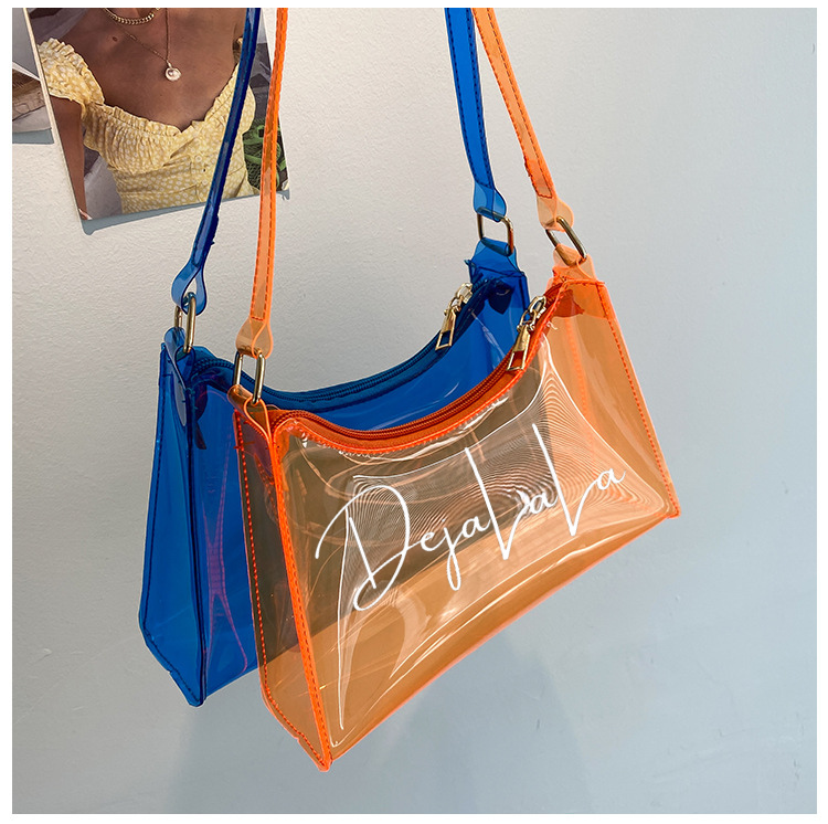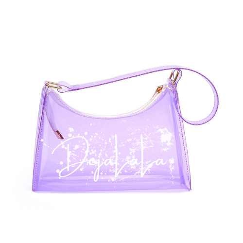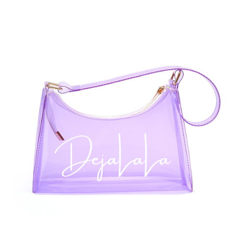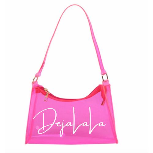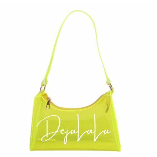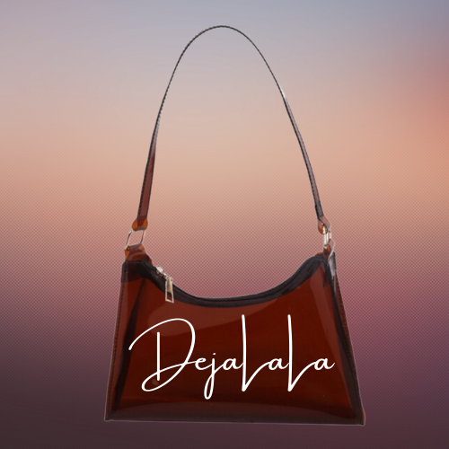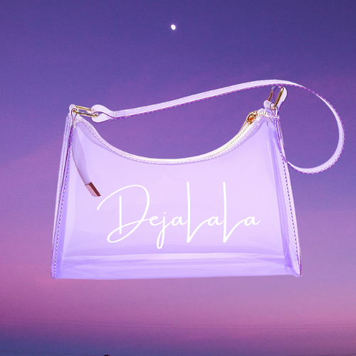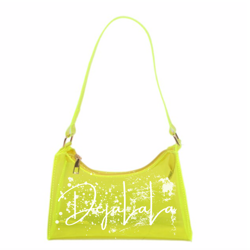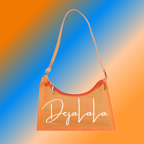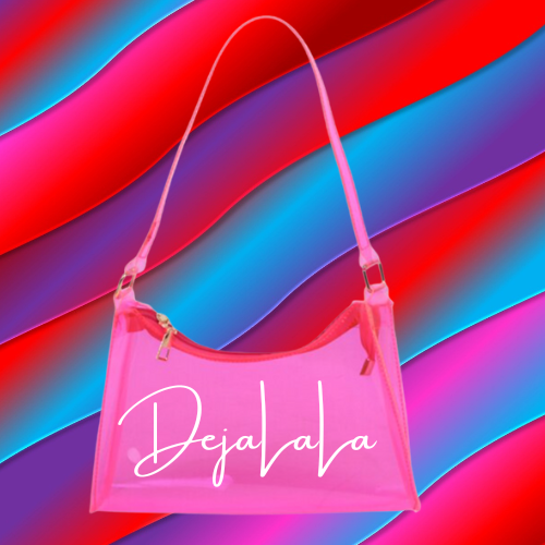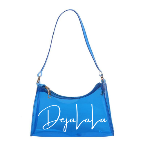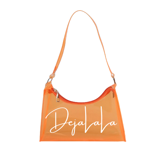 This one is a sweet treat for you! A candy inspired transparent handbag, customized with the "DejaLaLa" logo. This is available in the colors Black, Chocolate, Blue, Orange, and Lavender with your choice of paint splatter.